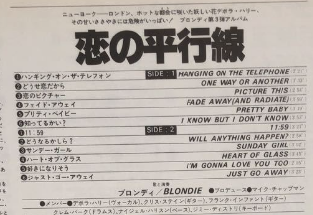 アルバム「恋の平行線」ではA面2曲目。“Heart Of Glass”に続く第二弾シングルで、全米シングルチャートは29位まであがりました。邦題は“どうせ恋だから”…国内盤シングルは出てないようですね。