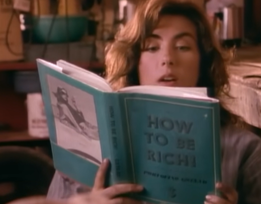 仕事中に「HOW TO BE RIGHI」という本を読み、もし自分が〇〇だったら…なんて空想する女性。