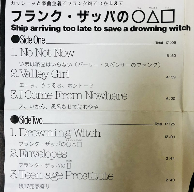 「Valley Girl」は、ザッパが出した曲の中でシングル・チャートのトップ40圏内に入った唯一の曲曲なんですね。この曲は、自宅スタジオにこもりきりのフランクの気を引こうとして、娘のムーンがスタジオのドアの下からメモをそっと差し入れたことがきっかけで生まれたそうです。そのメモで、ムーンは「女子高校生のへんてこなおしゃべりの物真似」をぜひ聴いて欲しいと父親に頼んだ、とのこと。