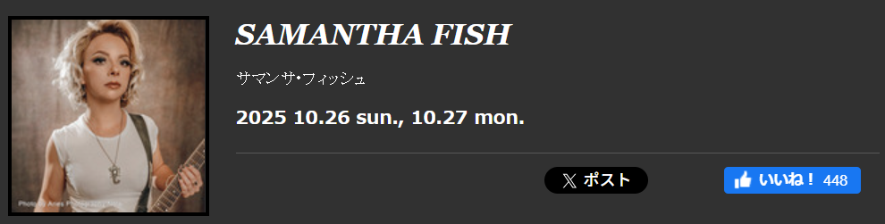 白いギブソンSGがトレードマーク!2020年代ブルース・ロックの本命ギタリスト、サマンサ・フィッシュが待望の初来日。米ミズーリ州カンサス出身。2011年に初ソロ作品『Runaway』を発表し、“ブルース・ミュージック・アワード・ベスト・ニュー・アーティスト”を獲得。ブルース、ロック、ソウルなど多彩な要素を持ったサウンドで注目を浴び、バディ・ガイの引退公演やローリング・ストーンズのUSツアーのオープニング・アクトを務め、エリック・クラプトンの“クロスロード・フェス”にも出演。昨年はジョン・スペンサーとの共同ツアー“Shake’s em on down”も話題に。ビルボード・ブルース・ロック・チャートで3週連続1位獲得し、グラミー賞にノミネートされた『Death Wish Blues』以来2年ぶりとなる新作『Paper Doll』を携えた本公演、伸びやかで艶やかなヴォーカルにも注目したい。