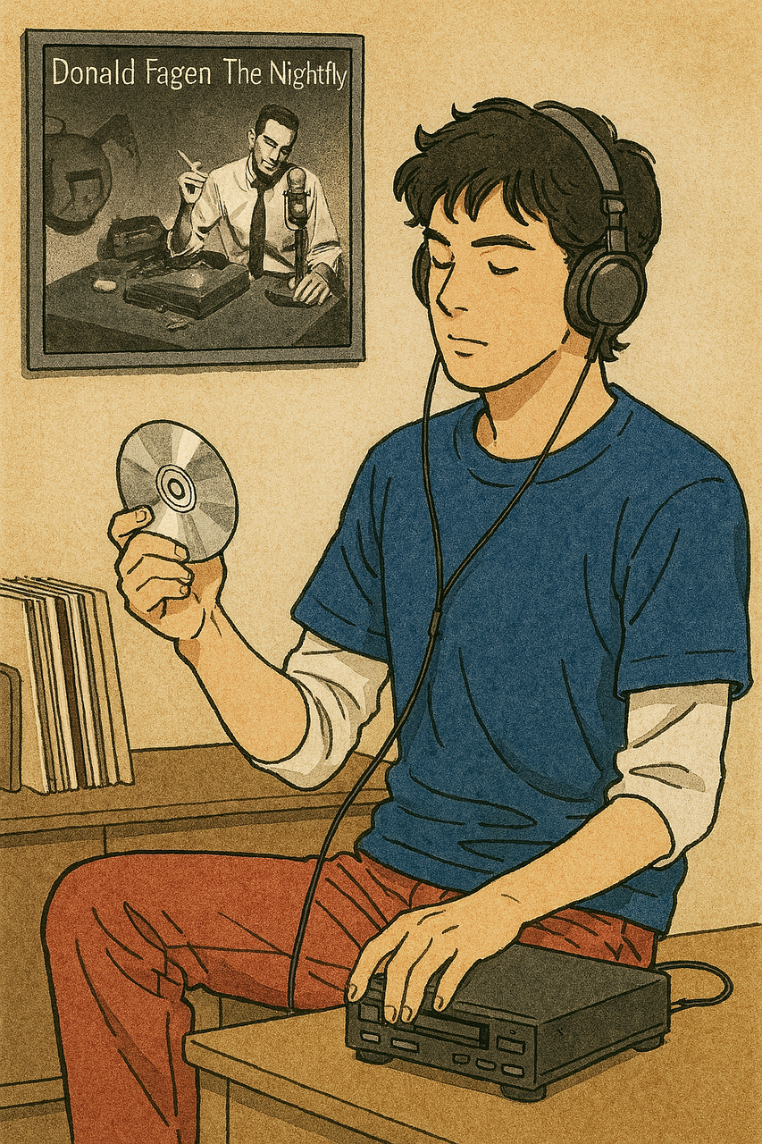 壁にはドナルド・フェイゲン「Nightfly」のジャケット...ということでCopilotくんにイラストを描いていただきました。