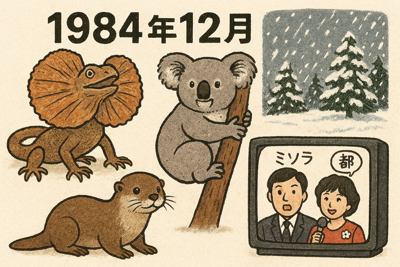 1984年12月には、エリマキトカゲブームやコアラブームが巻き起こり、異常気象として冬は大雪、秋には台風ゼロの状況が見られました。また、世相としては、エリマキトカゲやコアラ、ラッコなどの動物ブームが流行していました。