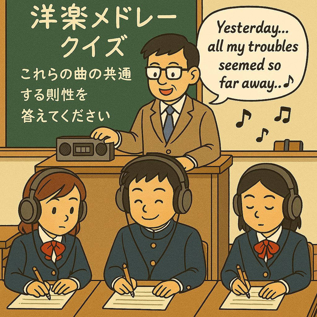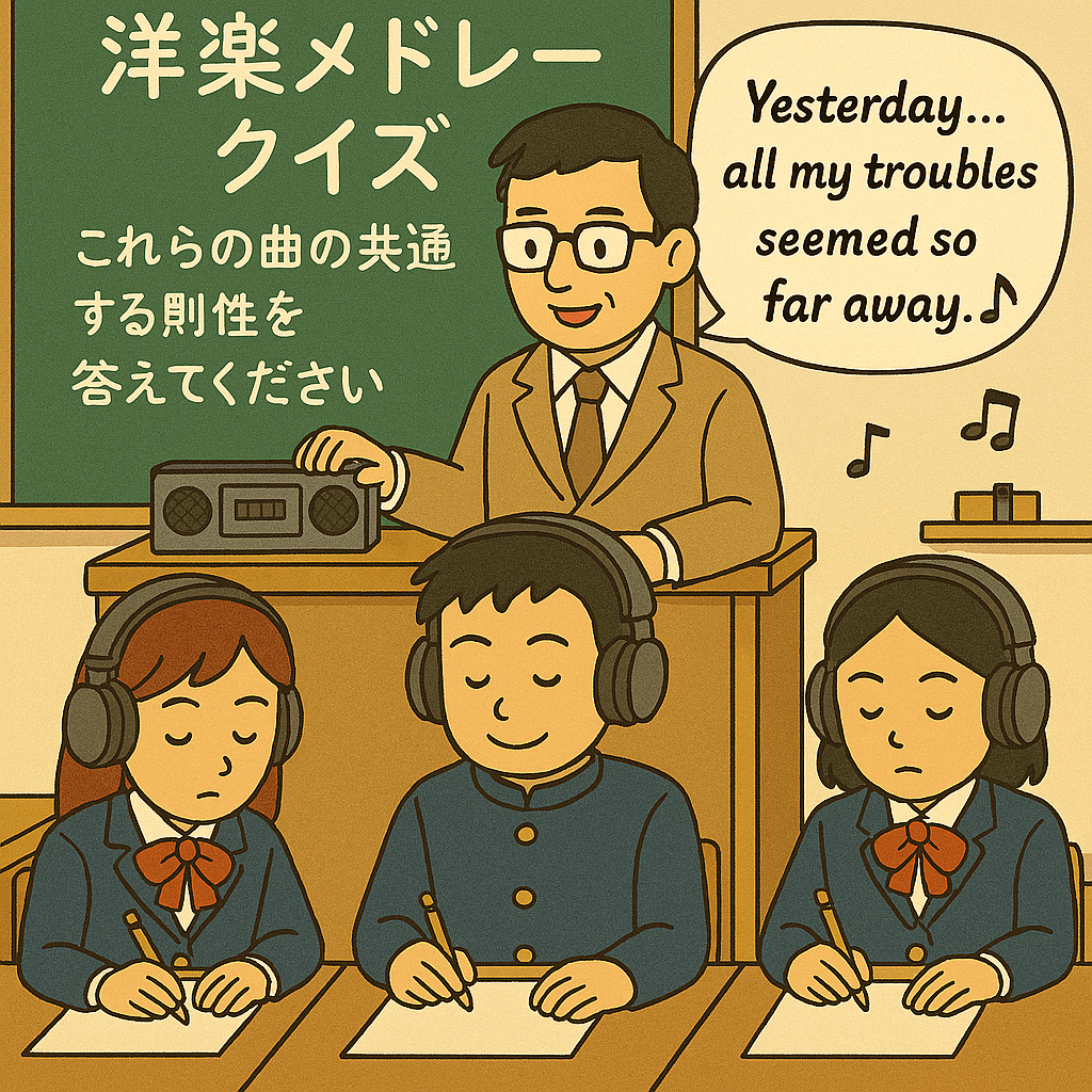 Copilotくんにメドレークイズのイラストを描いてもらったのですが、「ラジカセ」からYesturdayが流れてくる…ように描いてもらいたいのに、先生が歌ってる…。